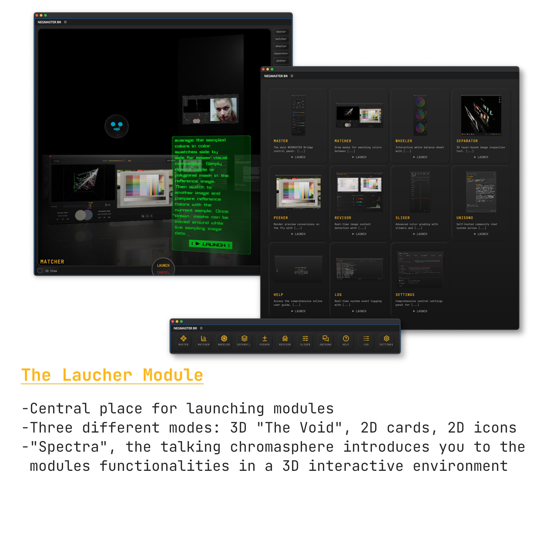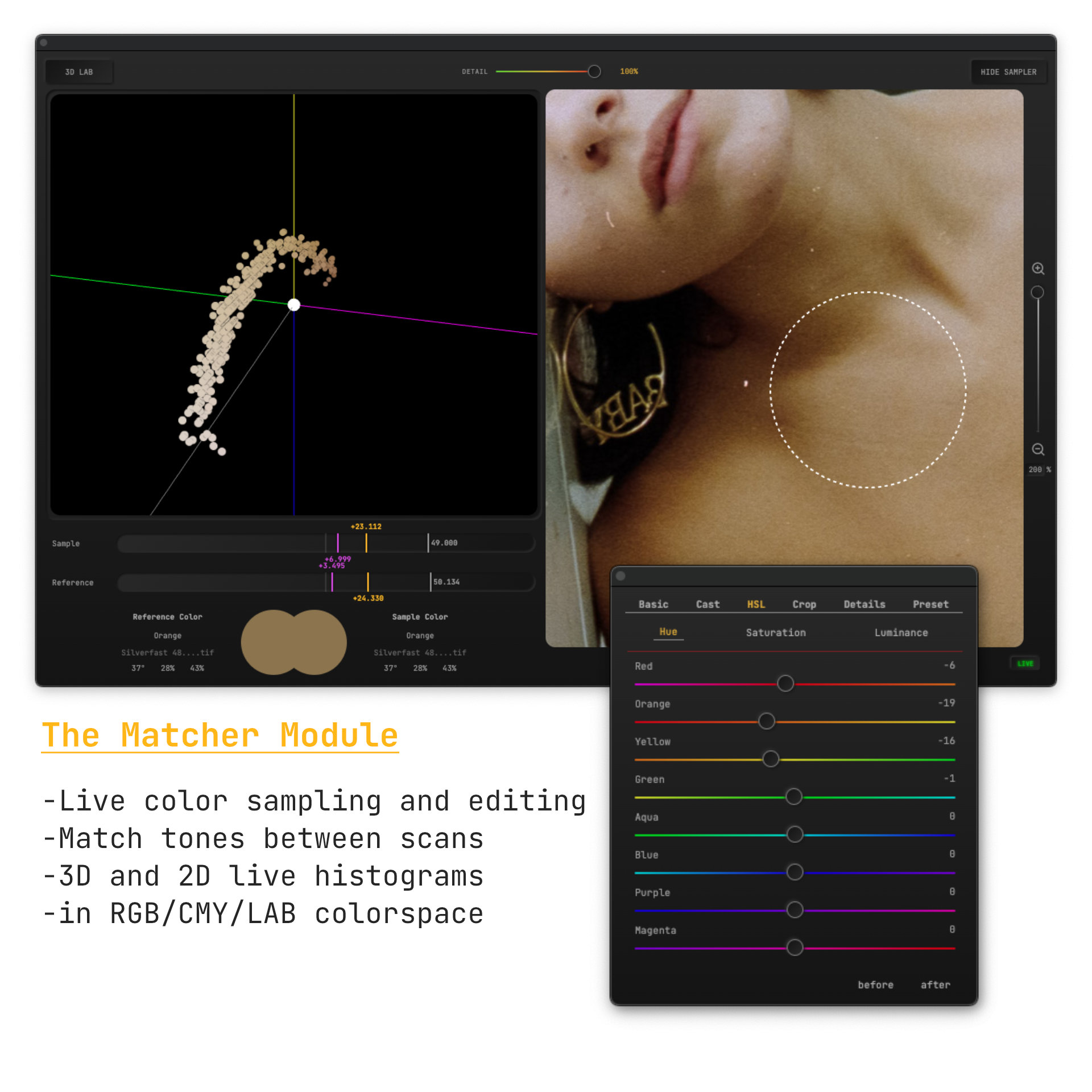 Matcher Module: compare colors in 2D and 3D between reference and target images, experience histograms in RGB, CMY, LAB