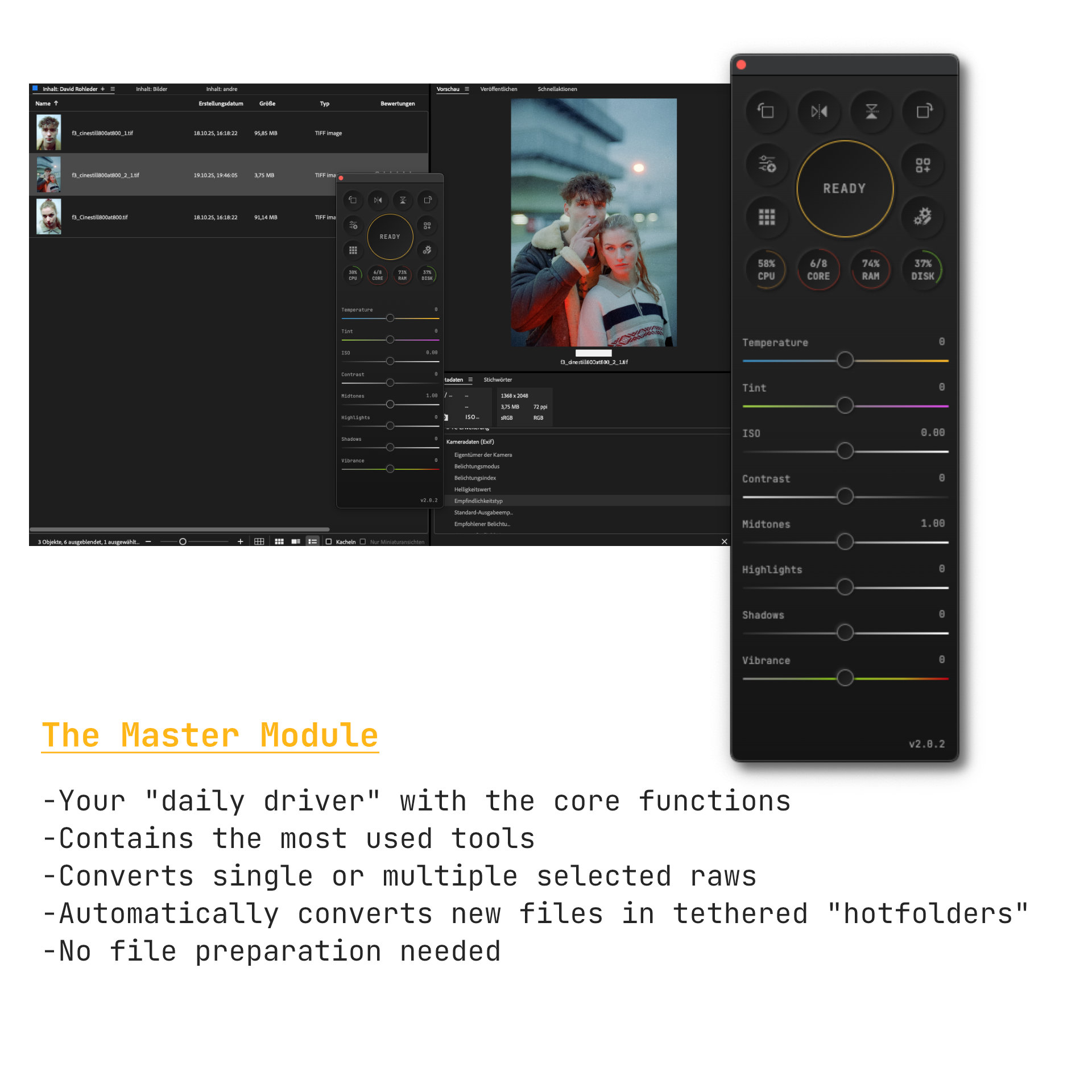 Fully nondestructive – Original RAWs remain untouched. All edits saved as Adobe-compatible XMP metadata.