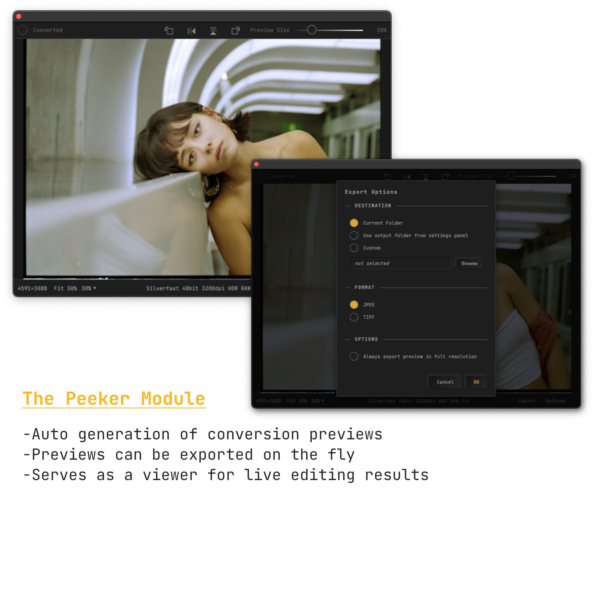 Peeker: live conversion previews, live editing converted scans, zoom up to 200%, rotation, flip, direct export to TIFF/JPEG