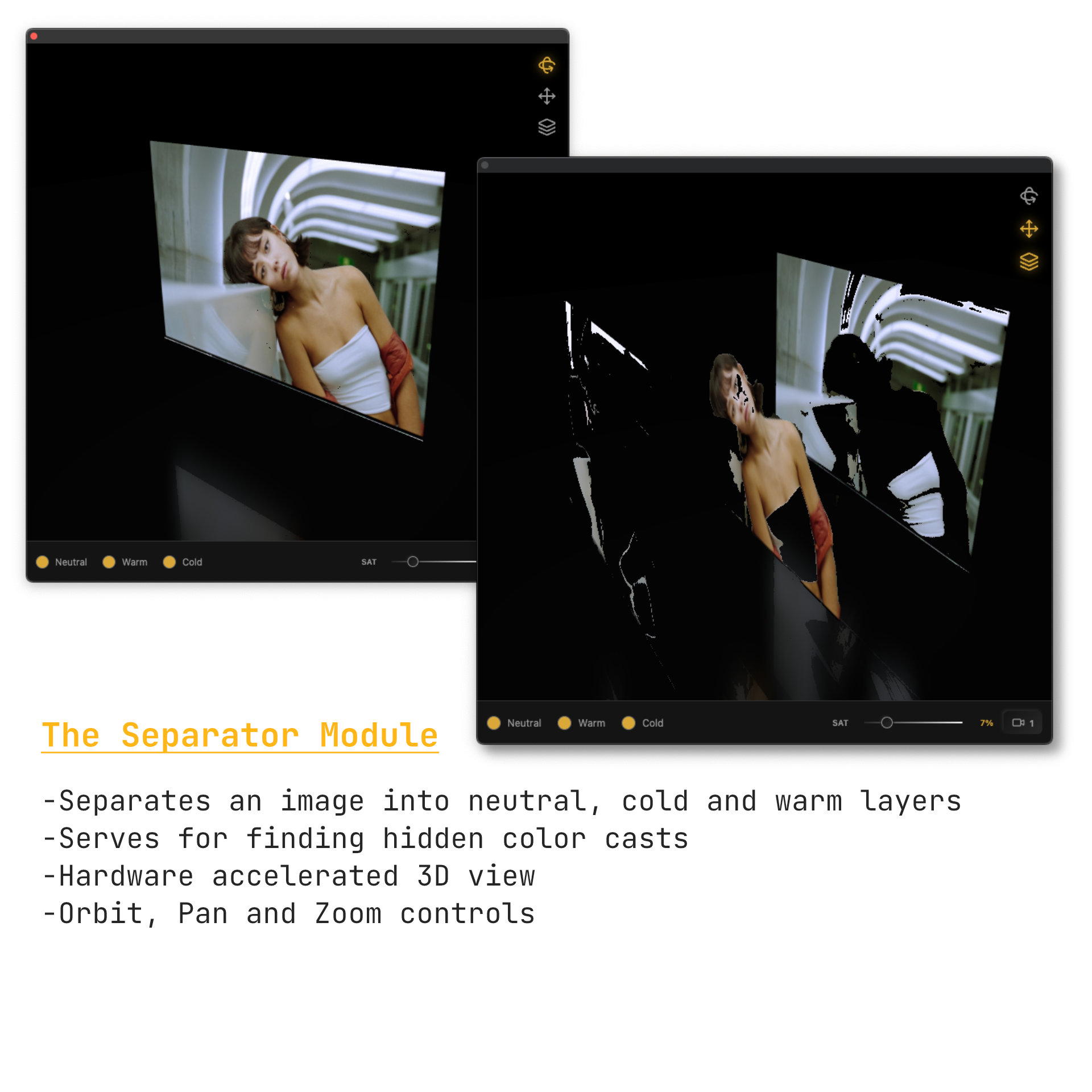 Separator Module: separate your images in 3D layers of neutral, cool and warm tones. Adjust saturation threshold to find hidden color casts.