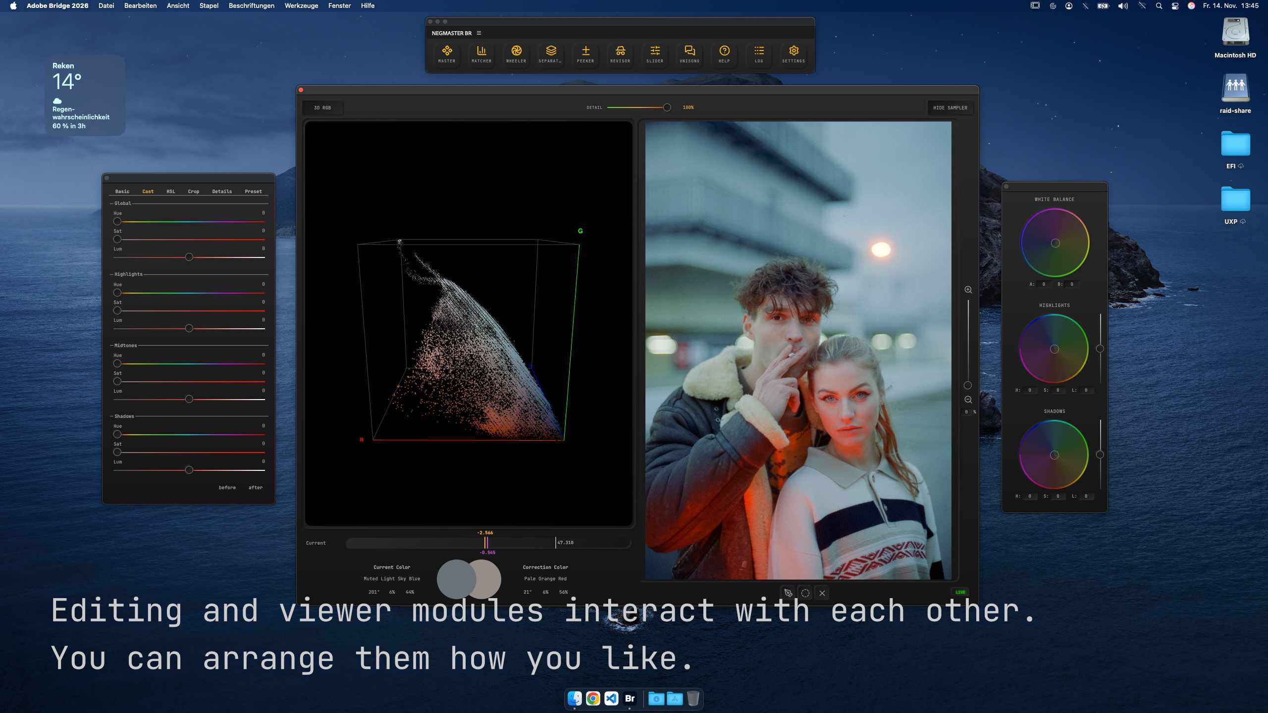 Authentic workflow, not an AI look generator – Full control through color wheels and 30+ sliders. If you want to generate a look – you can. Either save your edits as presets and apply them automatically on conversion or apply a ICC correction profile that can contain a LUT with the look you want.